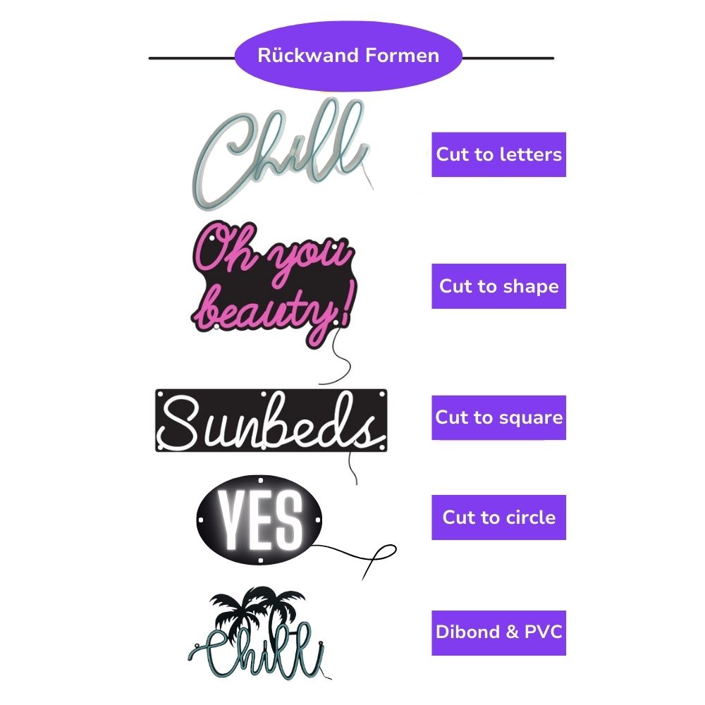 Ohne Acrylglas-Rückwand (Cut to letters): Hinter dem Neon Schild befindet sich kaum zusätzliches Material. Dieses Design bietet ein minimalistischen Look.